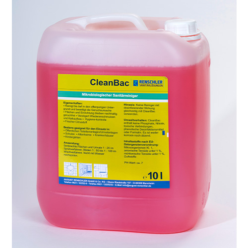 Jetzt gibt es unseren bakteriellen Reiniger CleanBac. Er enthält Myriaden von Bakterien, die das Ammoniak wegfressen. Mit CleanBac lösen Sie Geruchsprobleme in Sanitärräumen mit durchschlagendem Erfolg.